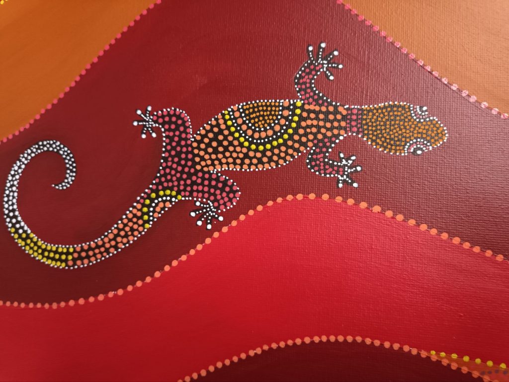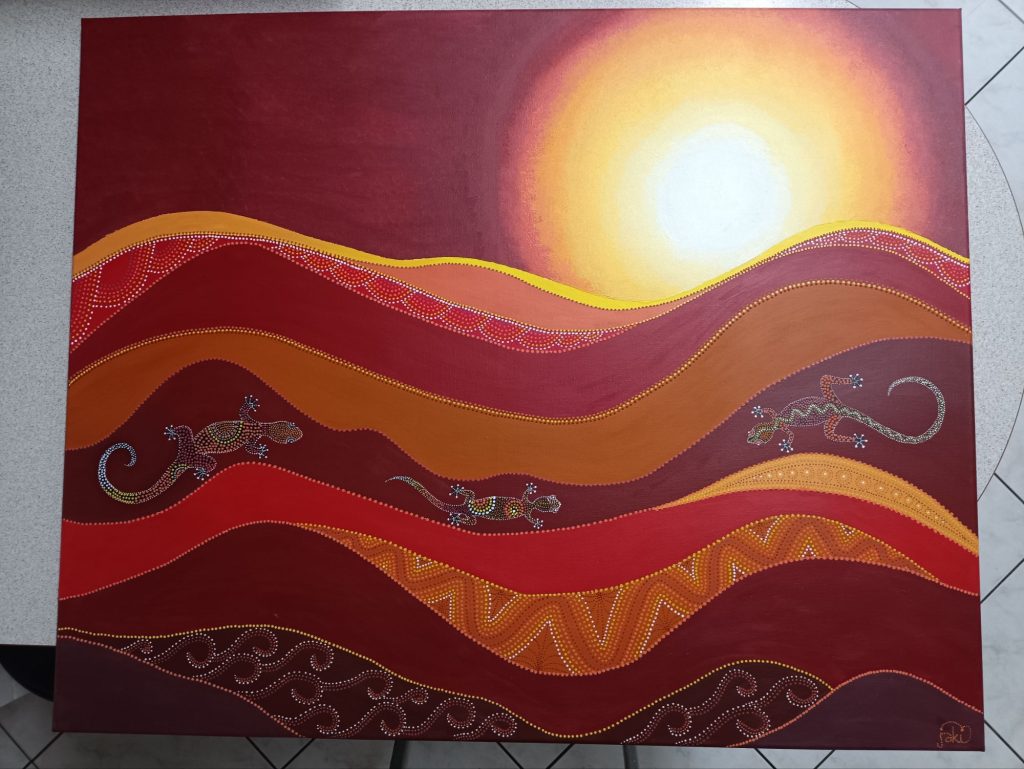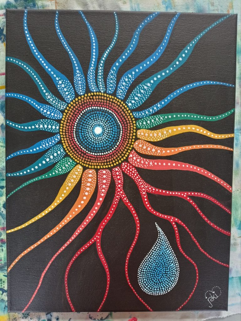 I’ve never done anything bigger than 30 x 40cm before, so the prospect filled me with dread. I bought a canvas – it looked enormous – how on earth would I fill it? I’m no great painter, so it would have to be fairly simple; I thought maybe I could do something sort of Aboriginal, with lots of dots. I tried out the technique on a smaller canvas and was happy with the result; now it was time to tackle the real thing.