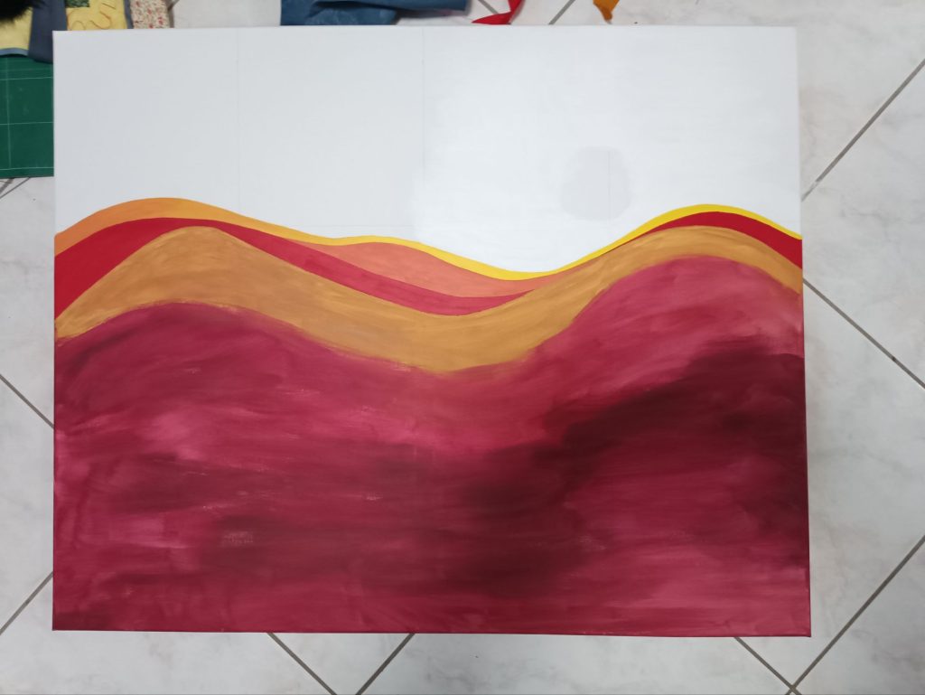 I asked a couple of people how to achieve a graduated colour effect, but their techniques didn’t work for me, so in the end I just slapped some paint on and dabbed at it with kitchen roll – maybe not a recognised technique, but it worked for me! The next problem was achieving nice clean lines between the colours, but I found bendy masking tape, which solved that one.