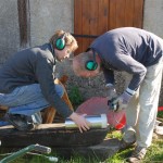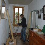 We’re going to the village new year’s eve bun fight tomorrow, so we offered to help with the setting up. Patrick, the organiser, arrived with his table plan; a table for each village that will be represented. So far, so good; a table for 10 here, one for 9 there, but 13? Not like that; they’ll be squashed together; not like that; they’ll be too far apart to talk from one side to the other. So they brought in a really battered old table top to add to the end of two tables; it was too long, so they thought they’d chop the end off, till it was pointed out that it was “egg box” construction, so that wouldn’t work either. Long, thin tables? Patrick wasn’t keen. The debate went on for ages, in super fast French; Nick and I were totally lost. Eventually they reached a compromise; some long thin tables and square ones for the groups of 9 and 10. We put them out, arranged the chairs, cut table cloth to length, put runners down the middle, added the table decorations, ran out, so we rearranged them, Natalie found the last three so we rearranged them again, then carefully “scattered” the sparkly bits which wish folks a joyeuse fete, all the right way up and legible. Next we tied baubles with floral ribbon all around the bar and put up the fairy lights. In the end, everyone was happy.