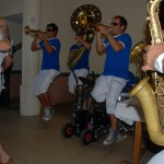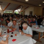 On Saturday morning there were fishing, walking and horse riding events organised, followed by a lunch under the trees in the village centre. Saturday night was paella night; a band played outdoors until the meal started at around 10.30pm, then followed us into the Salle des Associations and played throughout the meal. There was a bit of a panic as they estimated about 80 people would turn up for paella, whereas numbers actually topped 140, but they coped somehow.