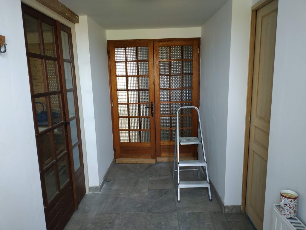 A few weeks ago, I painted the drawers Nick had made for my workshop and for years I’ve wanted to make the plain white cupboard doors more interesting; this felt like the right time. We took the doors down and put them on the gite kitchen tables, where I set to work. Many happy hours playing later, we rehung them. It may not be to everybody’s taste, but I’m pleased with the result.