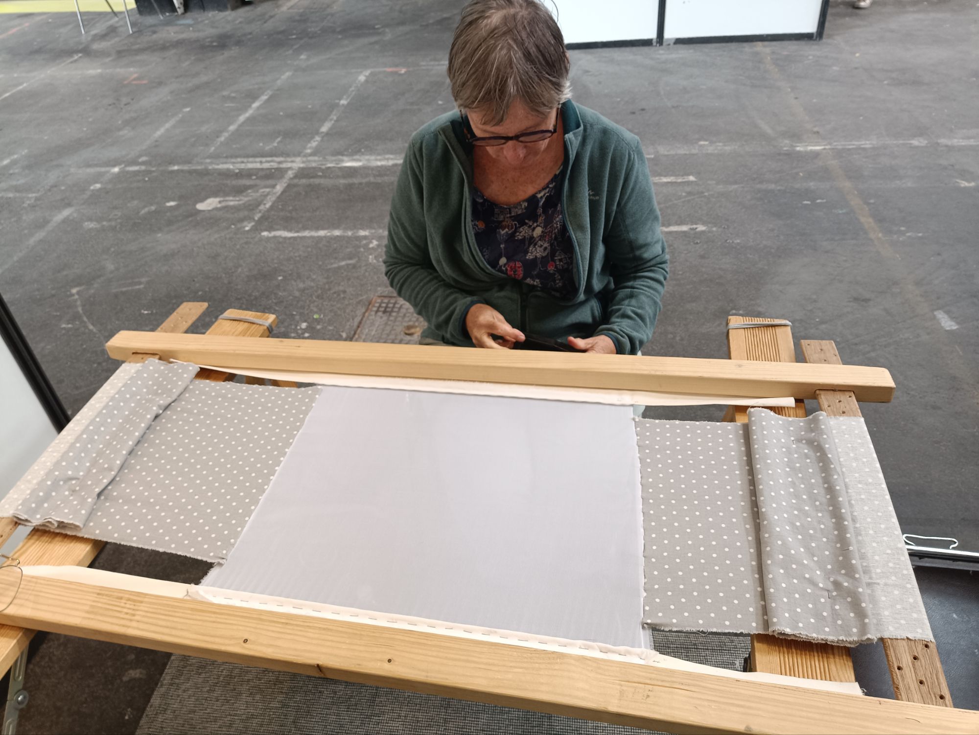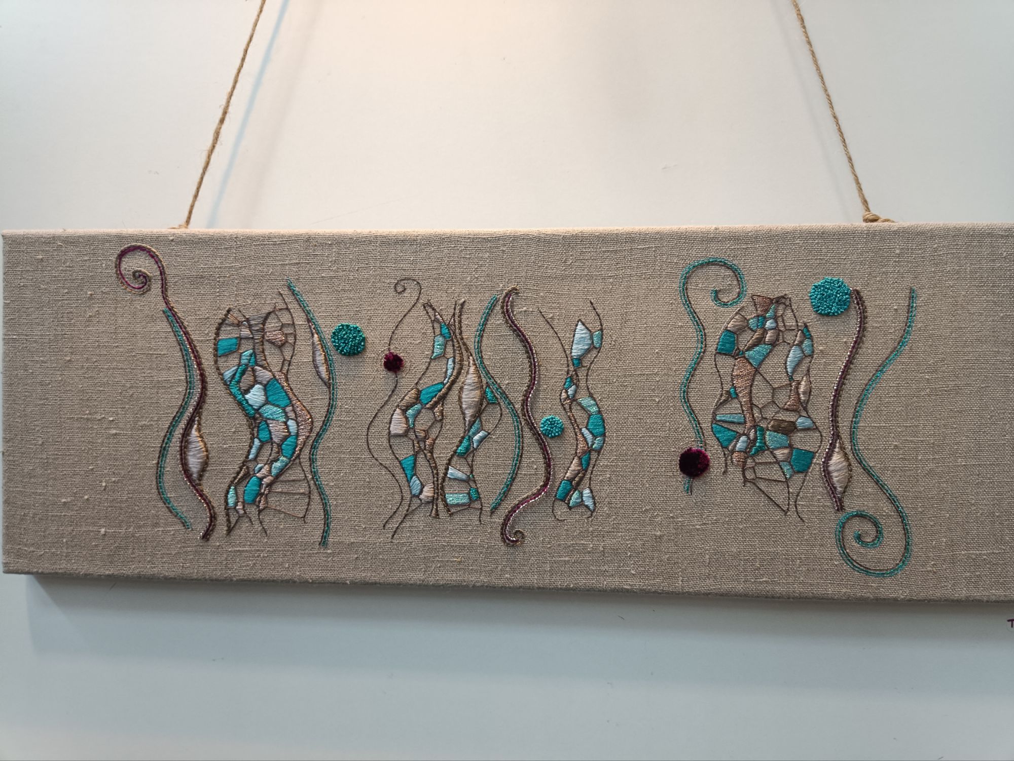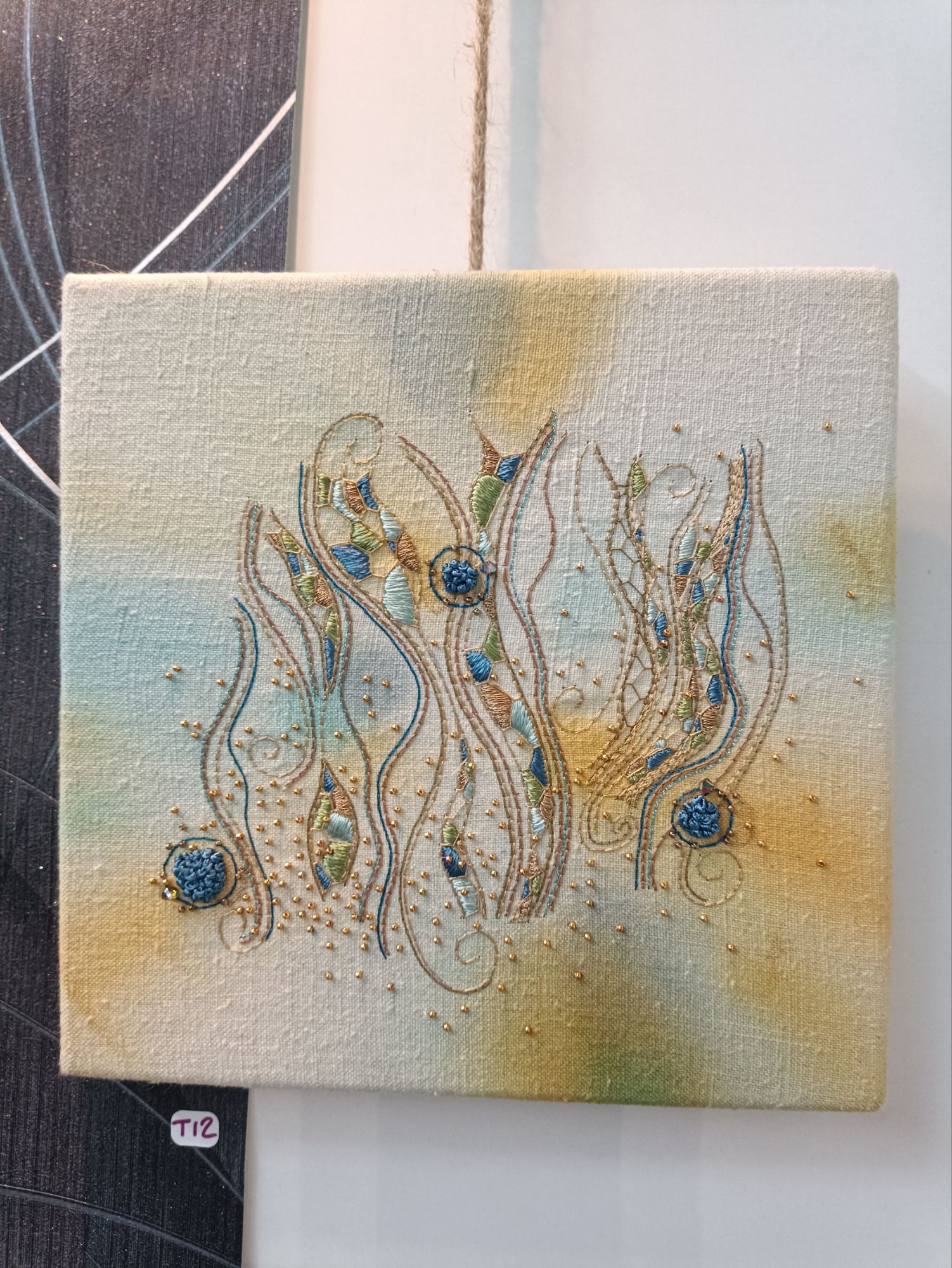 Tucked away near the back of the hall was a “Lunéville embroidery” stand; I’d never heard of this, but loved the work the artist had produced and could see so many possibilities for its use. There was a little notice offering courses, so I signed up. Jane said she’d have a go too, so we ate our picnic lunch and went back to the stand.